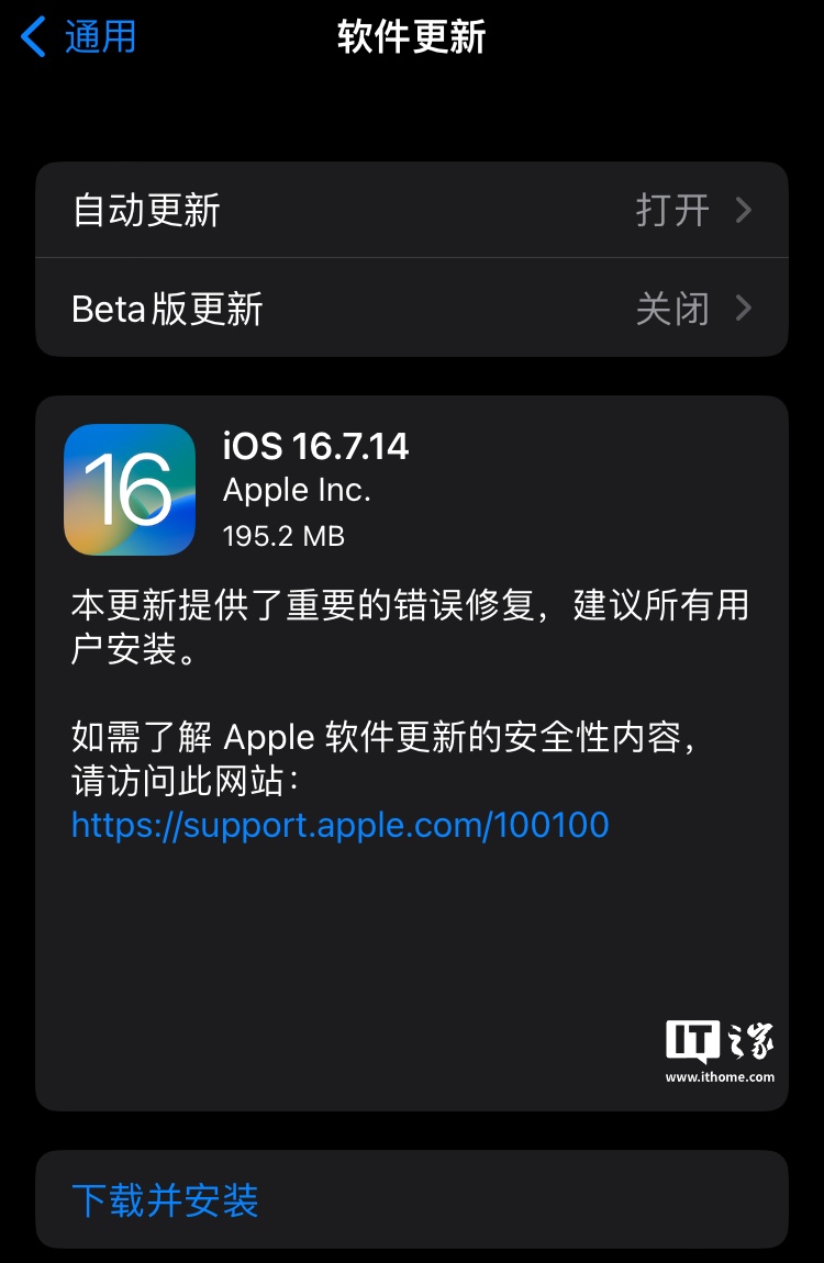 根据官方发布的 iOS 16.7.14 更新说明,苹果此次并未披露具体的安全漏洞修复信息,仅表示“提供了重要的错误修复,建议所有用户安装”。