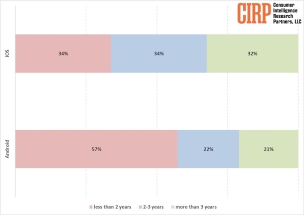 快科技10月4日消息,市场调研机构CIRP的最新报告显示,安卓用户在智能手机更新换代方面比苹果用户更为积极。