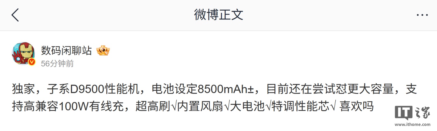 IT之家 2 月 3 日消息,博主 @数码闲聊站 今天在微博透露,某厂的子系天玑 9500 性能机设定 8500mAh± 电池。