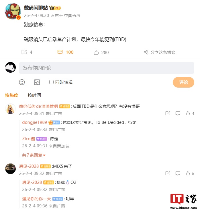 IT之家 2 月 4 日消息,博主 @数码闲聊站 今日发文透露,某厂磁吸镜头已启动量产计划,最快今年能见到。结合评论区讨论来看,适配磁吸镜头的新机预计为小米 MIX5。