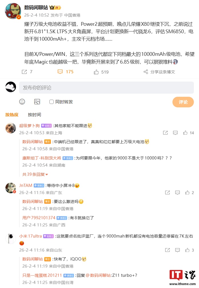 IT之家 2 月 4 日消息,博主 @数码闲聊站 今日发文称,荣耀万级大电池收益不错,Power2 超预期,晚点儿荣耀 X80 继续下沉。