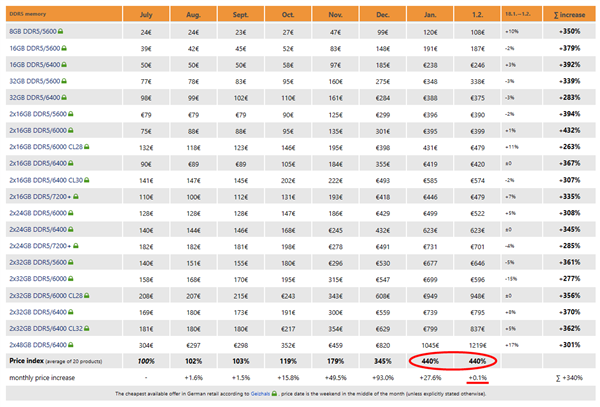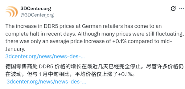 快科技2月4日消息,经历数月疯狂涨价后,DDR5内存价格似乎出现企稳迹象,根据3DCenter针对德国零售市场的监测数据,2026年2月初的DDR5内存平均价格较1月中旬,仅微涨了0.1%。