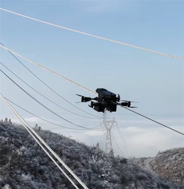 该机器人由国网湖南省电力公司研发,将飞行平台与除冰机构深度融合,无需无人机辅助,一键启动即可实现从空中部署到导线附着的全流程自动化操作,0.3秒完成高空精准挂载。