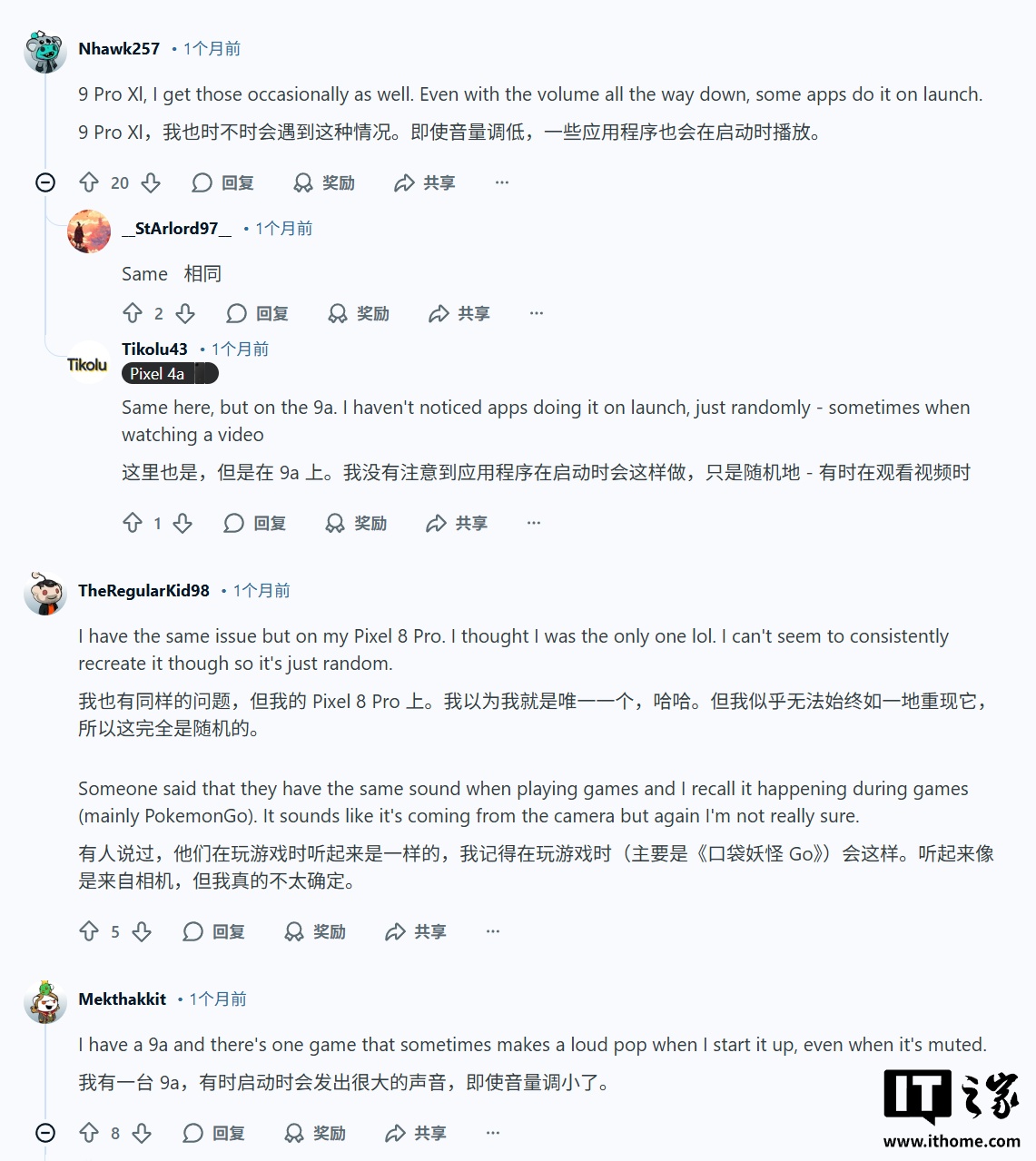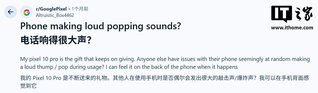 根据多名用户在 Reddit 社区发文,这些爆音是随机出现的,而且音量飘忽不定,有时候可能会相当响,随后有许多用户在评论区表示,自己的 Pixel 10 Pro、Pixel 9、Pixel 8 和 Pixel 7 都遇到了类似问题,表明这种故障并非局限于某一款机型。