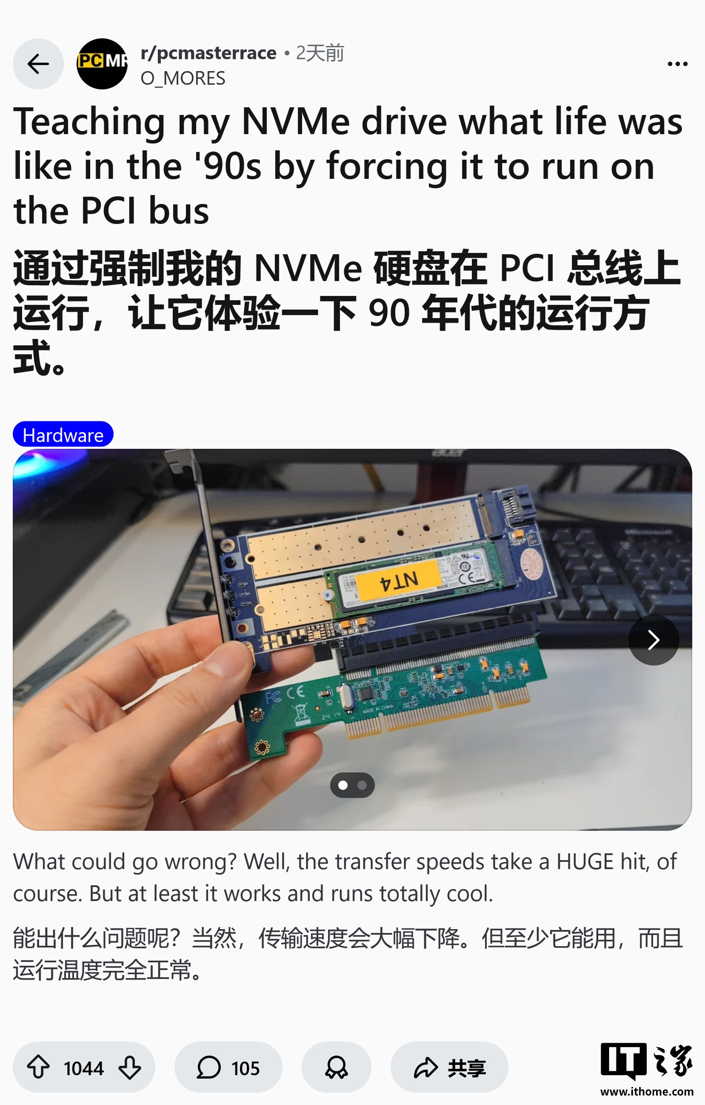 IT之家 2 月 6 日消息,网友 O_MORES 于 2 月 4 日在 Reddit 社区发帖,完成了一项跨越 20 年技术鸿沟的硬核实验:将现代 M.2 PCIe 3.0 固态硬盘接入 1992 年标准的古董 PCI 插槽(注意不是 PCIe)。