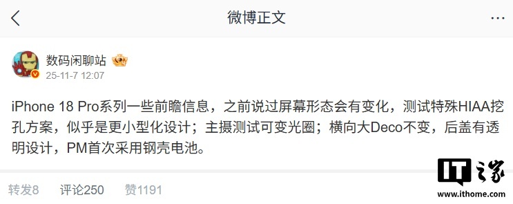 同时,@数码闲聊站 曾在此前透露,苹果正在测试特殊 HIAA 挖孔方案,似乎是更小型化设计;而 iPhone 18 Pro 的主摄正测试可变光圈方案,可根据拍摄环境灵活调整真实景深,实现更多样化的照片风格。