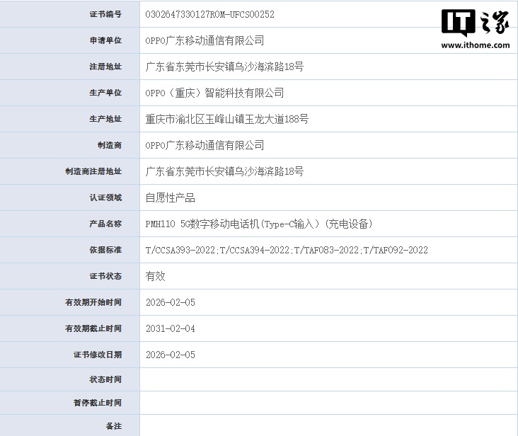 IT之家 2 月 6 日消息,OPPO 有多款新机通过 UFCS 融合快充认证,充电功率未公布: