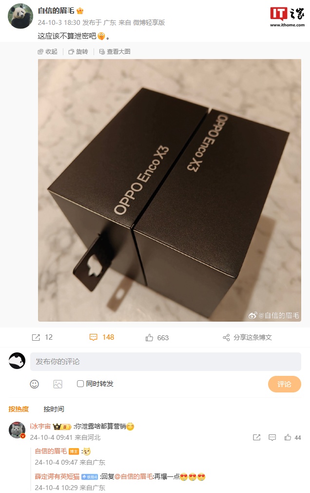 IT之家 10 月 5 日消息,OPPO 前副总裁沈义人于 10 月 3 日发布一张“OPPO Enco X3”包装盒照片,并配文“这应该不算泄密吧”。