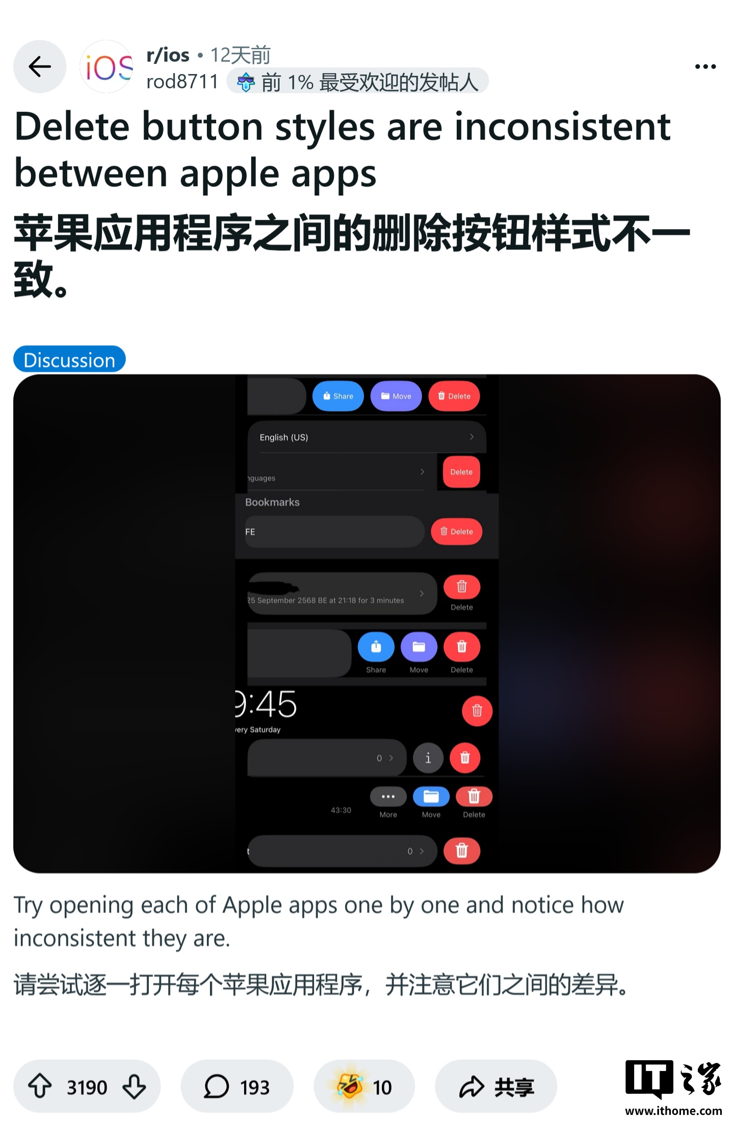 IT之家 2 月 7 日消息,科技媒体 Cult of Mac 昨日(2 月 6 日)发布博文,报道称近期 Reddit 社区热议话题之一,就是苹果 iOS 系统的“删除按钮为何千奇百怪”。
