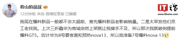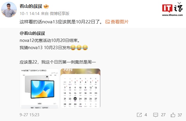 IT之家 10 月 5 日消息,据博主 @看山的叔叔 今日发文称,华为 nova 13 系列手机预计 10 月 8 日官宣 / 预热,7 日将带来爆料。