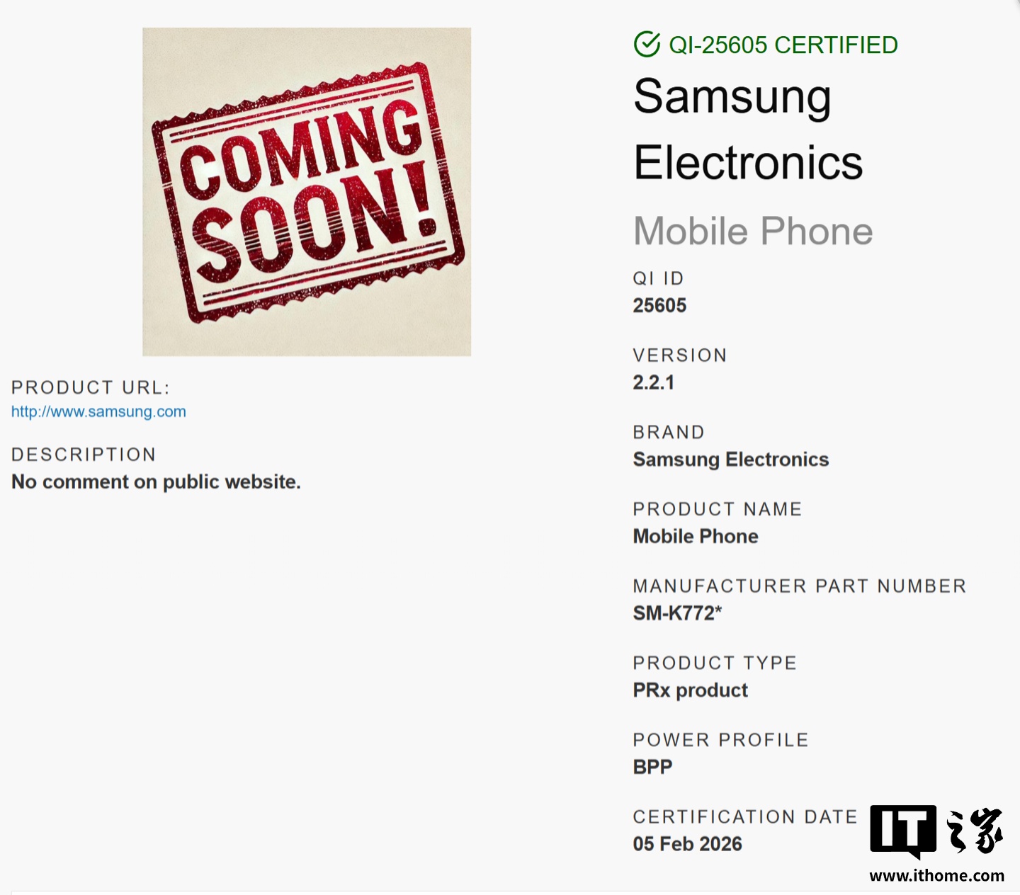 认证信息显示这三款手机均支持 Qi 2.2.1 标准,与谷歌 Pixel 10 系列相同。不过这三款新机均采用 BPP(基础功率配置)配置而非 MPP(磁吸功率配置),意味着手机自身并未内置磁铁,需要戴上磁吸保护壳才能够使用 Qi2 充电器、充电宝或卡包等配件。