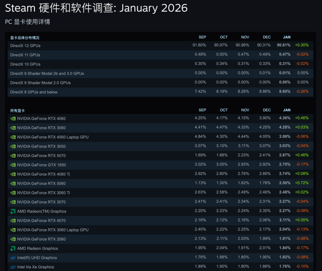 实际上,在“网上人均 5090”的时代,游戏电脑的主流硬件规格是比较反直觉的,就拿 Steam 最新的硬件调查报告来说,多数之选的显卡是 RTX 4060 和 RTX 3060 等甜品卡,最受欢迎的处理器都是 6 核心的中端货。