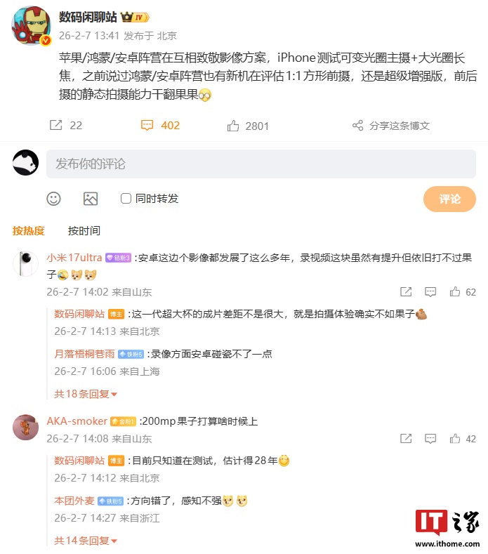 有网友感叹安卓影像都发展多年录视频虽有提升但依旧打不过苹果,博主表示:“这一代超大杯的成片差距不是很大,就是拍摄体验确实不如果子。”还有网友询问苹果何时配备 2 亿像素镜头,博主回复称:“目前只知道在测试,估计得 28 年。”