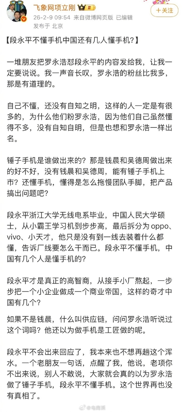 “如果不是钱晨,什么叫供应链,问问罗永浩听说过这个词吗?他还以为做手机是工匠做的呢。段永平不会出来回应了,我本来也不想再趟这个浑水。一个老朋友一句话,点醒了我,他说,老项你不出来说,别人不敢说,大家就会真的以为罗永浩做了锤子手机,段永平不懂手机。这个世界再也没有真相了。”项立刚无奈的说道。
