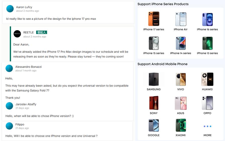 很多用户询问 REETLE SmartInk I 能否支持不同型号的手机 ( 左 );REETLE 后续增加了更多 iPhone 和安卓系的手机型号|图源 Kickstarter