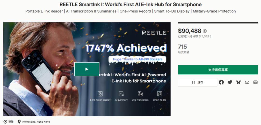 而 REETLE SmartInk I,笔者在最初看到其众筹项目时抱有很大的期待,但在层层加法下,REETLE SmartInk I 却没能复刻 Plaud 的成功,其众筹成绩目前不到 10 万美元。