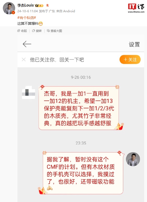 一加中国区总裁李杰今日分享了一则私信消息:有网友询问一加 13 手机是否能复刻一加 1/2/3 代手机的木质壳,他回复称暂时没有这个 CMF 计划,但有木纹材质的手机壳可以选择,还带磁吸功能。