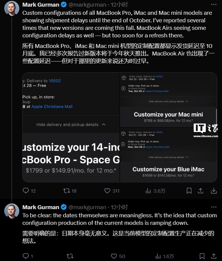 IT之家 10 月 6 日消息,彭博社记者 Mark Gurman 今日发布消息称,所有 MacBook Pro、iMac 和 Mac mini 机型的定制配置都显示发货延迟至 10 月底。