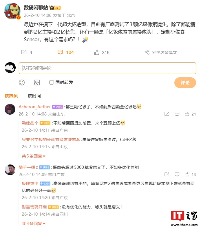 IT之家 2 月 10 日消息,博主 @数码闲聊站 今日发文称最近在摸下一代超大杯选型,目前有厂商测试了 3 颗亿级像素镜头,除了 2 亿主摄和 2 亿长焦外,还有「亿级像素前置摄像头」,采用定制小像素 Sensor 方案。
