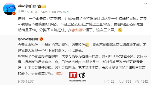 韩伯啸昨日回复 iQOO 产品经理 @戈蓝 V“这次三个屏”的评论,称新机三个屏都是定制的,开始就做了点特殊设计以达到一个特殊的目标。定制 + 采购成本确实要好多亿,不过上亿支出在屏幕上是正常的。