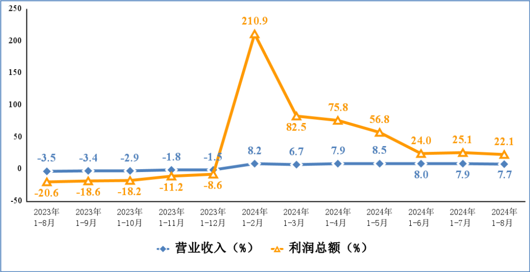 1—8 月,规模以上电子信息制造业实现营业收入 9.94 万亿元,同比增长 7.7%,较 1—7 月回落 0.2 个百分点;营业成本 8.68 万亿元,同比增长 7.4%;实现利润总额 3928 亿元,同比增长 22.1%;营业收入利润率为 4.0%,较 1—7 月提高 0.1 个百分点。8 月份,规模以上电子信息制造业营业收入 1.32 万亿元,同比增长 6.2%。