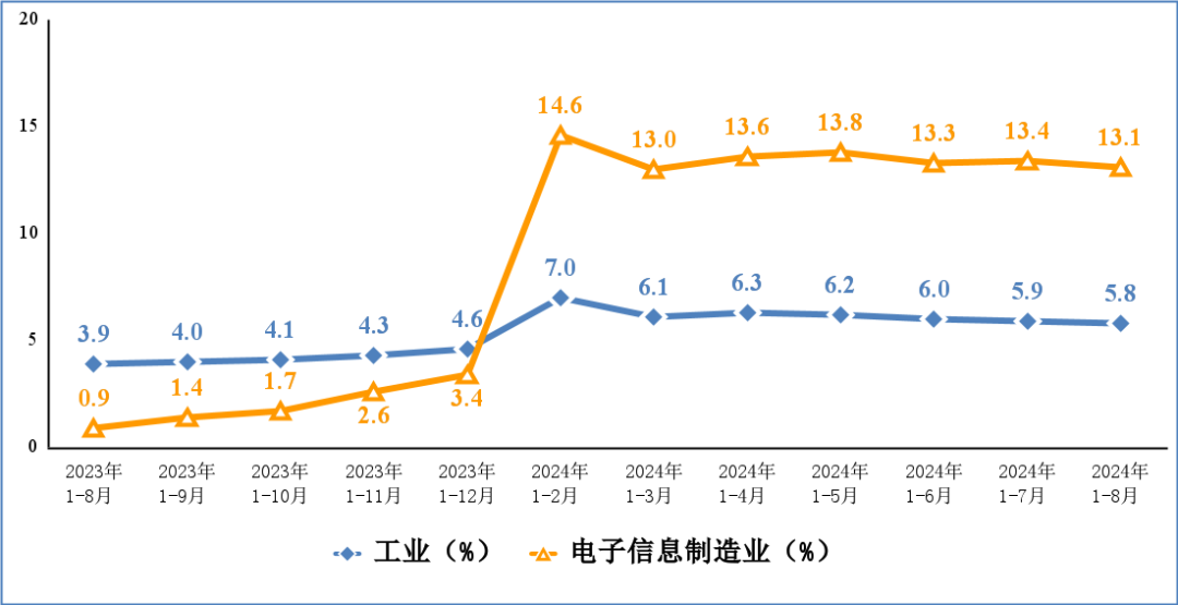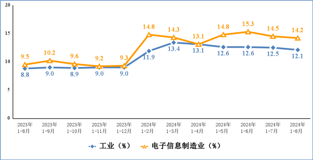 1—8 月,电子信息制造业固定资产投资同比增长 14.2%,较 1—7 月回落 0.3 个百分点,比同期工业、高技术制造业投资增速分别高 2.1 个和 4.6 个百分点。