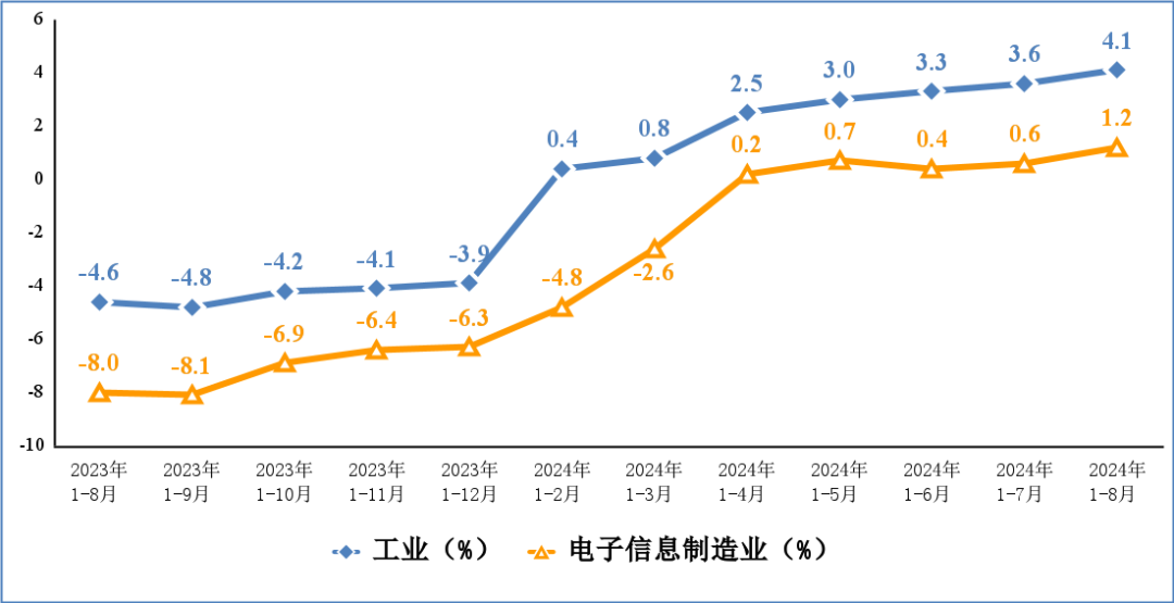 1—8 月,规模以上电子信息制造业累计实现出口交货值同比增长 1.2%,较 1—7 月提高 0.6 个百分点。8 月份,规模以上电子信息制造业实现出口交货值同比增长 3.4%。