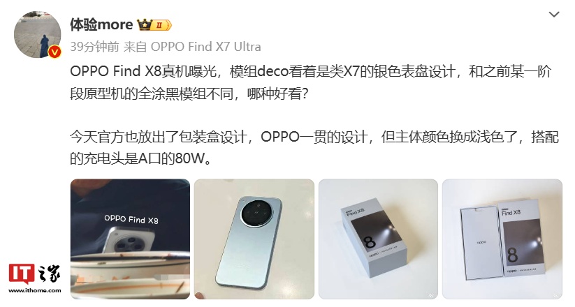 IT之家 10 月 6 日消息,博主 @体验more 今日分享了 OPPO Find X8 真机照片,并配文“OPPO Find X8 真机曝光,模组 Deco 看着是类 X7 的银色表盘设计,和之前某一阶段原型机的全涂黑模组不同”。