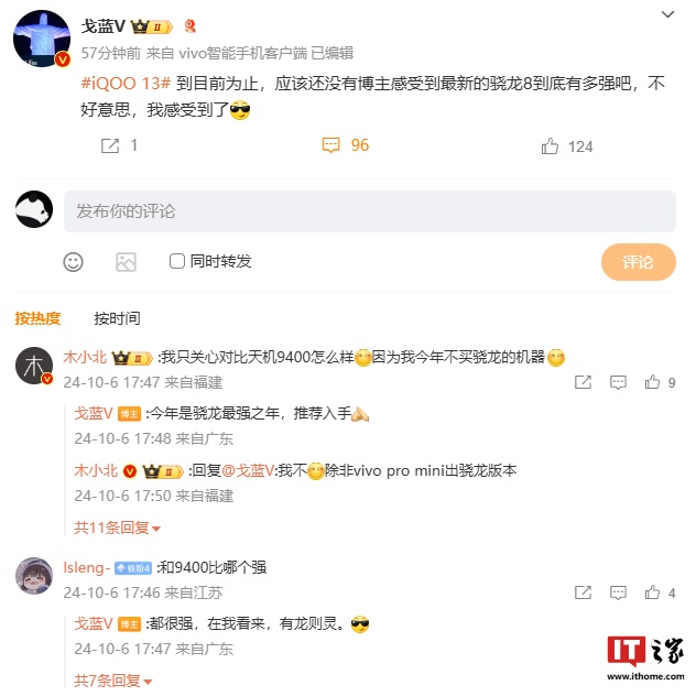 IT之家 10 月 6 日消息,iQOO 产品经理 @戈蓝V 今日连续发文预热 iQOO 13 手机。从他微博插入的话题来看,新机有望搭载最新的骁龙 8 处理器,支持百瓦 PPS 快充。