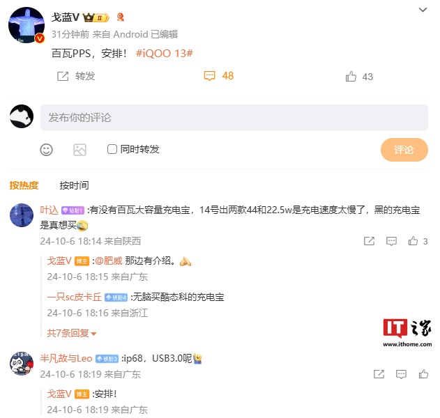 评论区中有网友询问 IP68 和 USB3.0 支持情况,@戈蓝V 回复称“安排”,暗示新机有望支持 IP68 防护等级以及 USB 3.0 有线传输。