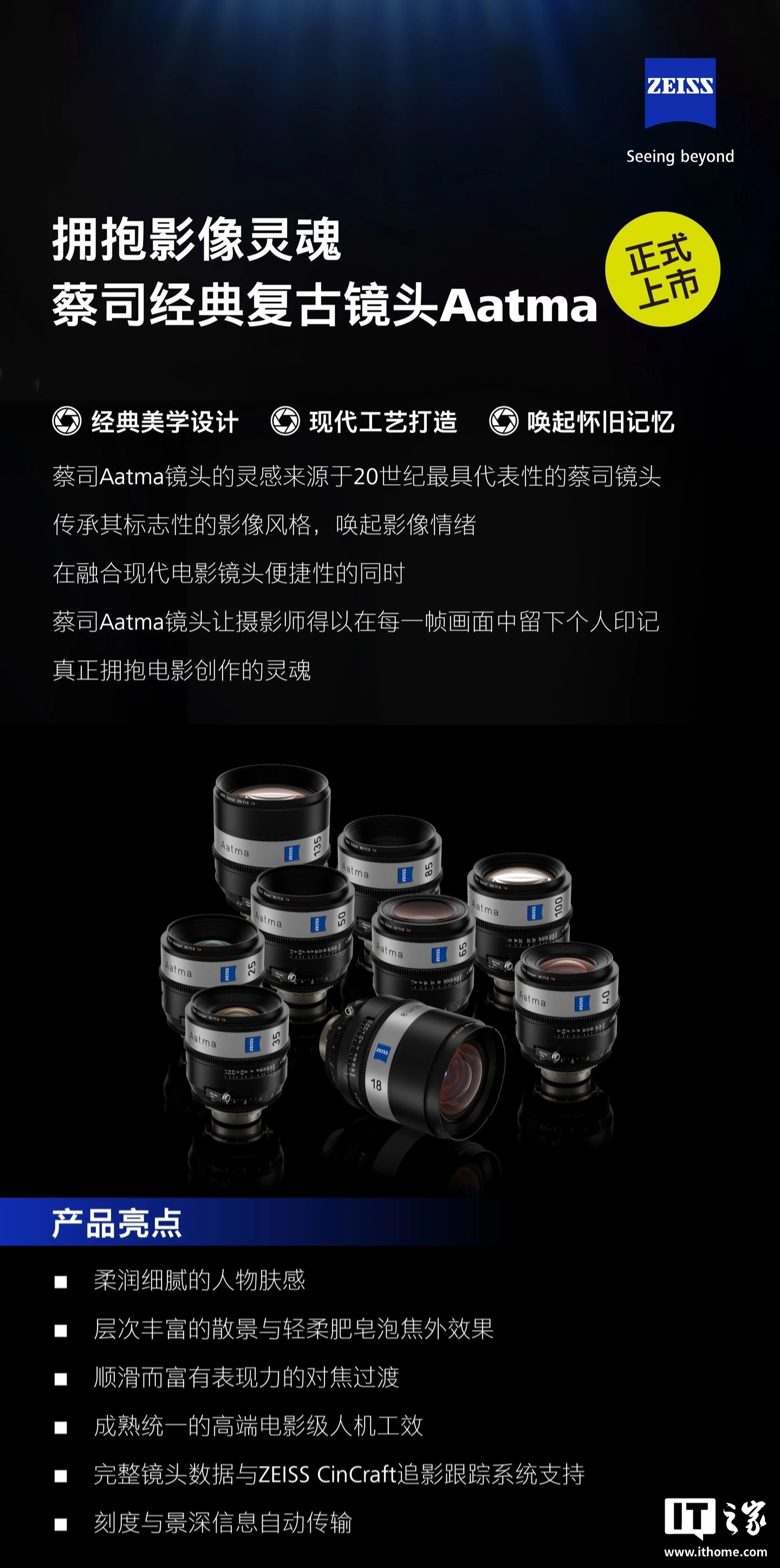 IT之家 2 月 10 日消息,据蔡司影像公众号今日发文,蔡司经典复古镜头群 Aatma 现已上市,主打复古影调。