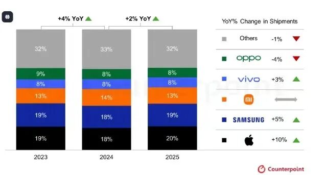 来自市场研究机构Counterpoint Research发布的统计数据显示:2025年,受新兴市场需求走强以及经济动能改善的推动下,全球智能手机市场实现全球出货量同比增长2%。