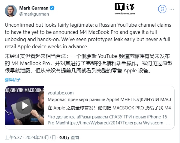 IT之家 10 月 7 日消息,今日一位俄罗斯 YouTuber Wylsacom 发布了一段视频,宣称这是首个展示搭载 M4 芯片的 14 英寸 MacBook Pro 的开箱视频,该视频还披露了 M4 Mac 的首批基准测试结果。