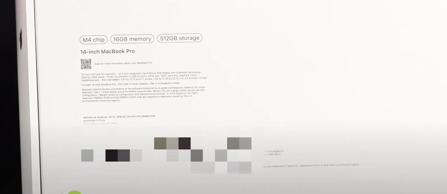 该视频展示了 M4 MacBook Pro 的完整开箱过程,其包装盒与上个月曝光的包装盒一致,并显示该设备配备了 512GB 存储空间、16GB 内存、三个 Thunderbolt 4 端口、一个 HDMI 端口、一个 SD 卡插槽以及 MagSafe 磁吸充电接口。据包装盒上的规格信息,M4 芯片拥有 10 核心 CPU 和 10 核心 GPU,比 M3 芯片的 8 核心 CPU 有所升级。
