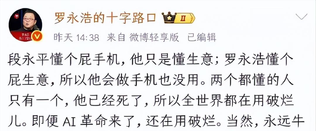 这场争论的导火索相当微妙。一名网友在微博上对比了段永平和罗永洪的不同路径,认为段永平比罗永浩“高明”之处在于“一个懂手机,一个不懂”。