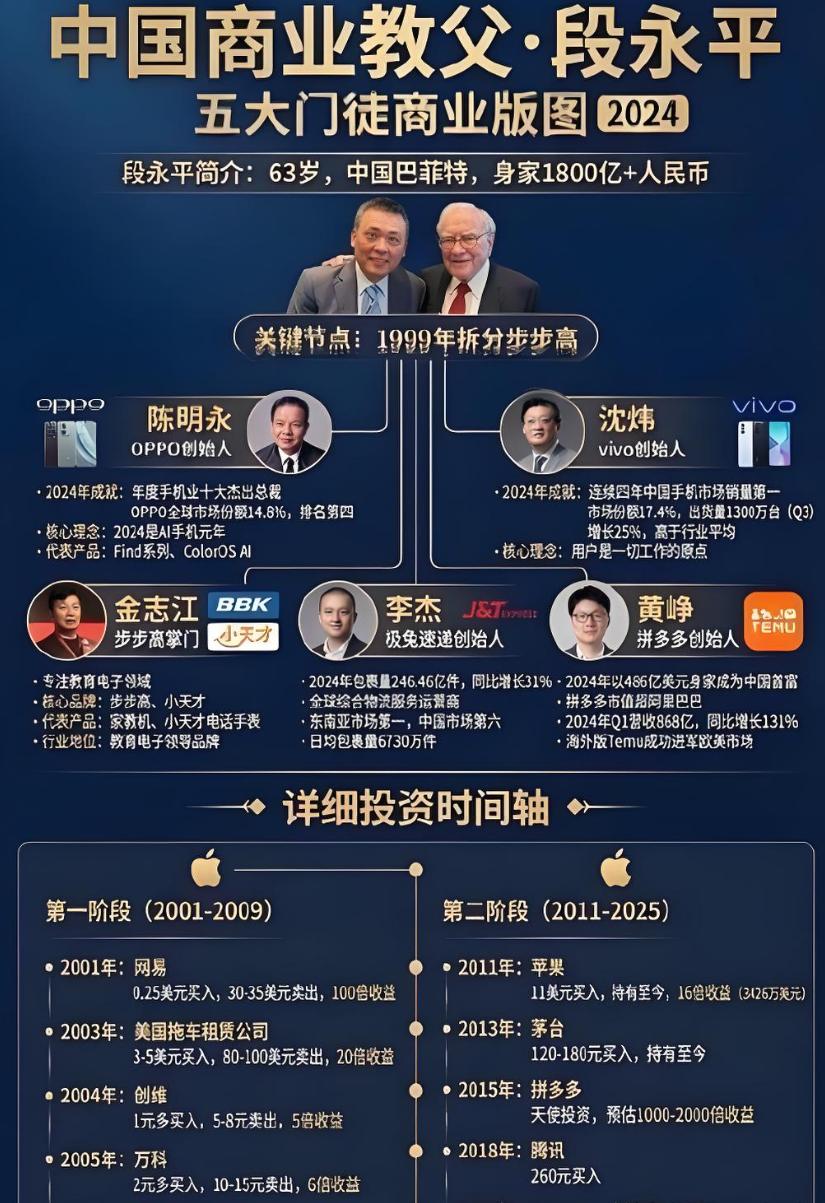 段永平的商业影响力远不止于个人投资。他培养和影响的“门 徒”们,在中国科技和商业领域构成了一个庞大的网络。