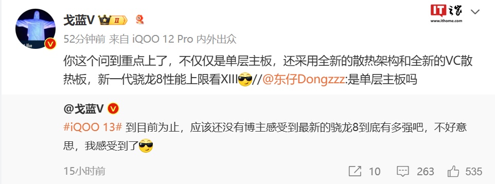 IT之家 10 月 7 日消息,iQOO 产品经理 @戈蓝V 今日透露,iQOO 13 手机采用单层主板,以及全新散热架构和 VC 散热板。
