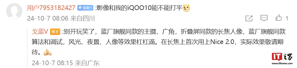 影像方面,他表示 iQOO 13 采用蓝厂(vivo)旗舰同款的主摄、广角,折叠屏同款的长焦人像,蓝厂旗舰同款算法和调试,风光、夜景、人像等效果“杠杠滴”。