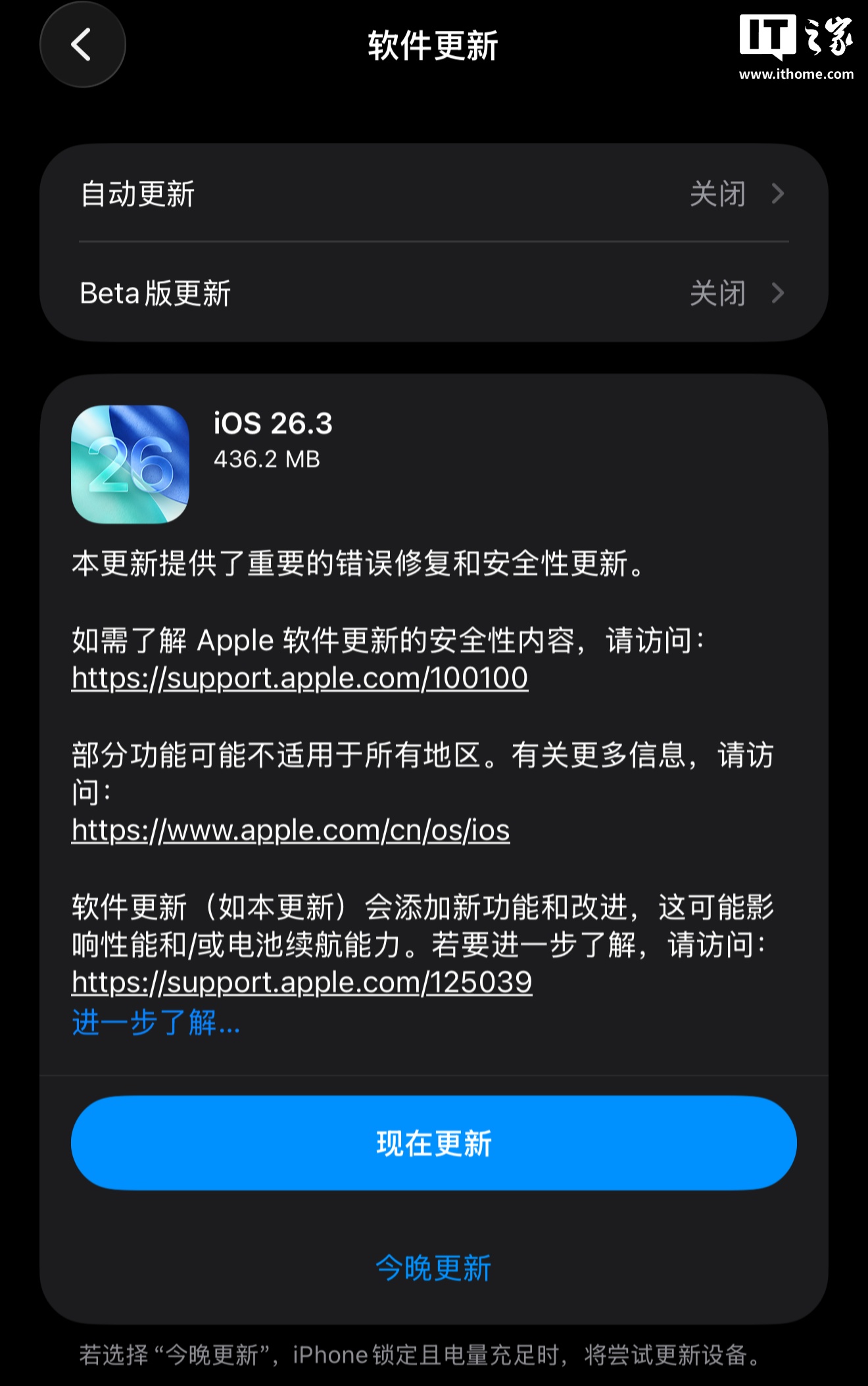 IT之家 2 月 12 日消息,苹果今日向 iPhone 和 iPad 用户推送了 iOS / iPadOS 26.3 更新(内部版本号:23D127),本次更新距离上次发布正式版间隔 16 天。