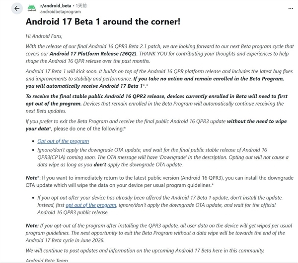 谷歌在公告中明确表示,Android 17 Beta 1将集成最新的错误修复程序,并针对系统稳定性和运行效率进行了深度优化。对于已经加入Beta预览计划的用户,如果不进行任何额外操作,Pixel设备将会在发布第一时间通过OTA自动收到Android 17 Beta 1的升级推送。