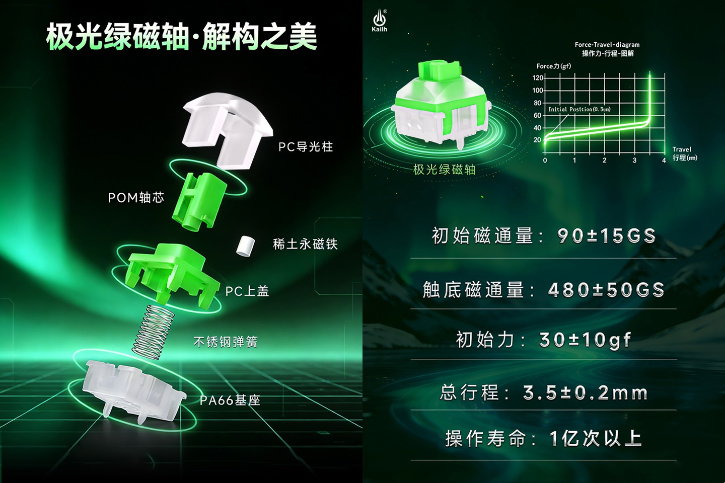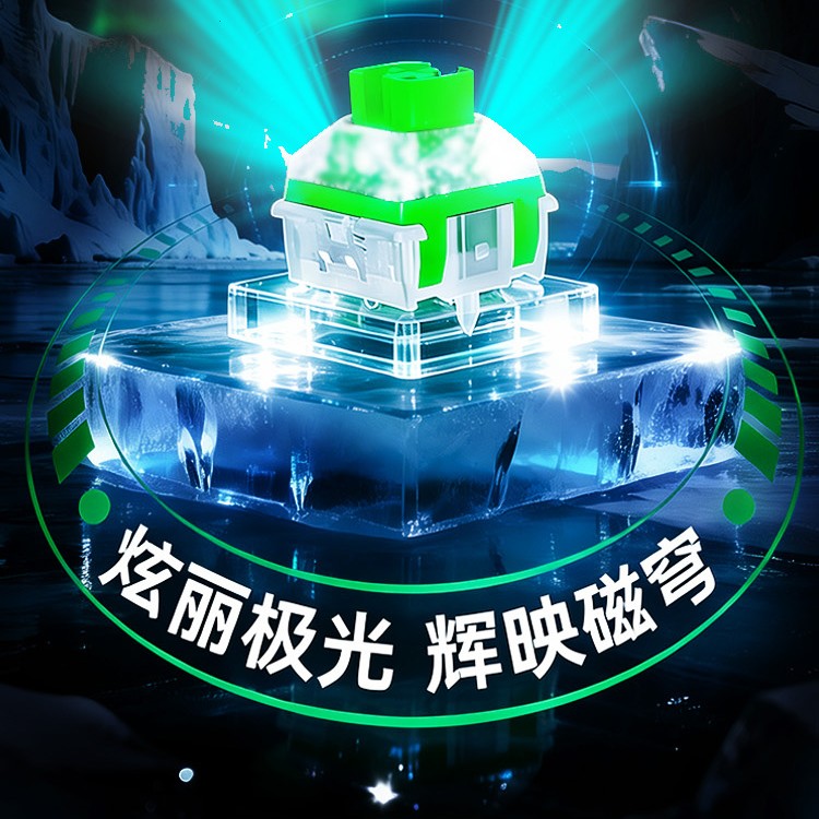 以极光绿磁轴为例,这款轴体由 PC 导光柱、PC 上盖、POM 轴芯、稀土永磁铁、不锈钢弹簧、PA66 尼龙底座组成,初始力度 30±10gf,总行程 3.5±0.3mm,操作寿命超 1 亿次,初始磁通量 90±15GS、触底磁通量 480±50GS。