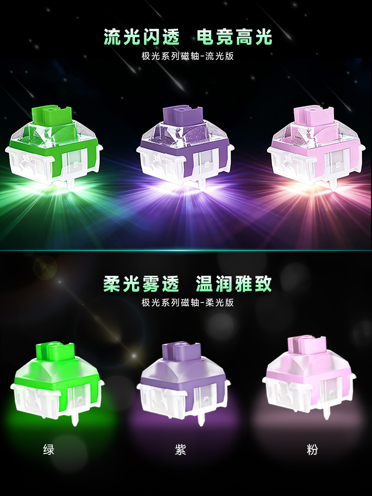 凯华表示,极光磁轴基于全透光材质,适配各种背光设计的键盘;其采用高精度工艺,通过新模具新技术“有效改善回弹发声逻辑,大幅优化轴芯回弹触顶的撞击声,极致顺滑,将按压杂音消除殆尽”。