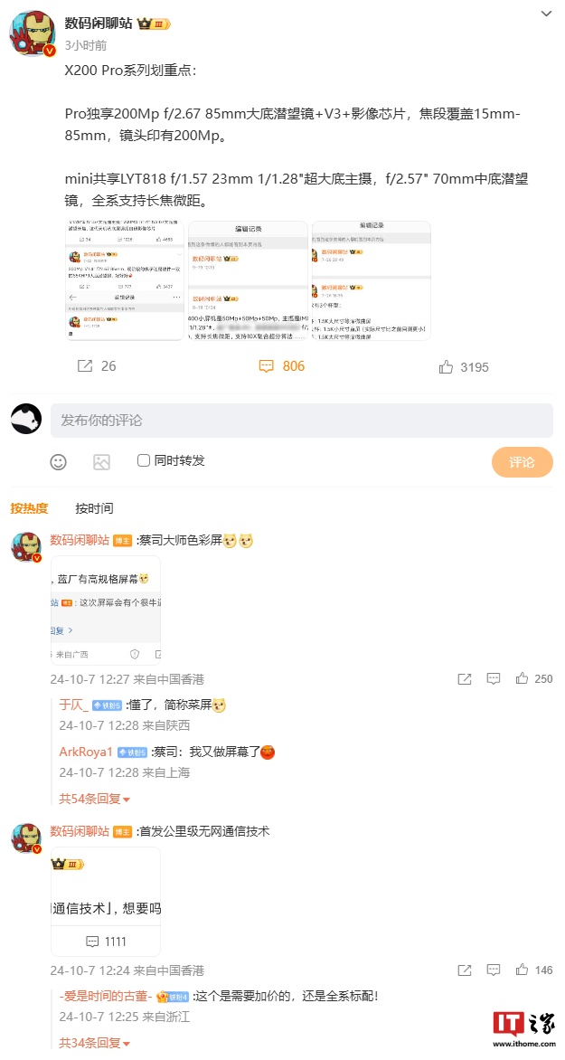 博主 @数码闲聊站 今日发文透露 vivo X200 Pro 系列机型配置信息,IT之家附详情如下: