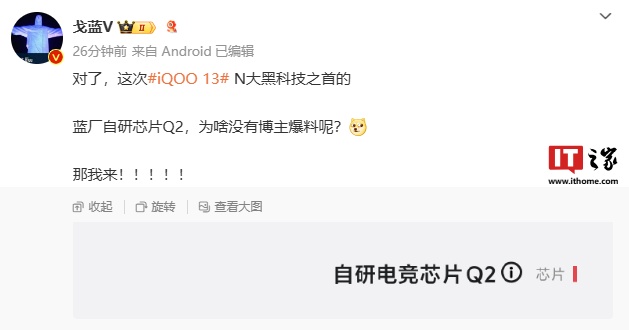 IT之家 10 月 7 日消息,iQOO 产品经理 @戈蓝V 今日发文称,iQOO 13 手机将搭载自研电竞芯片 Q2。