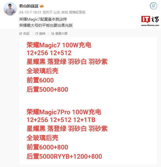 IT之家 10 月 7 日消息,博主 @看山的叔叔 今日发文爆料“荣耀 Magic 7”系列手机配置信息,该系列新机将提供标准版 / Pro 两款机型(Ultra 暂未公布),全玻璃后盖、支持 100W 快充。