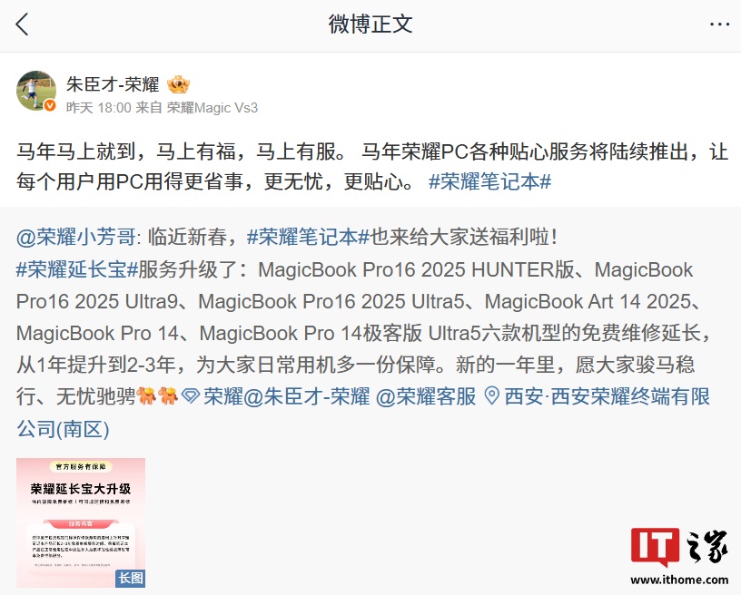 IT之家注意到,荣耀终端股份有限公司 PC 产品总经理 @朱臣才-荣耀 还透露,马年荣耀 PC 还将陆续推出其他贴心服务。从其“更省事,更无忧,更贴心”的描述来看,预计是指产品售后、后期维护方面的相关权益。