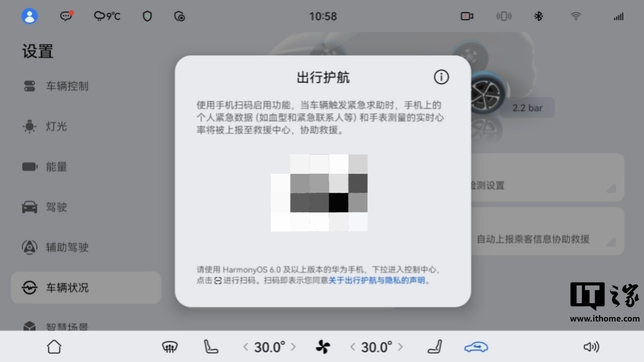 1、在车机设置 → 车辆状况 → 出行护航,点击出行护航会弹出二维码界面;