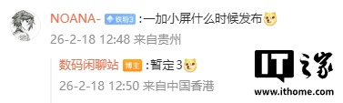 IT之家 2 月 20 日消息,据博主 @数码闲聊站 2 月 18 日爆料,一加小屏新机暂定 3 月发布。
