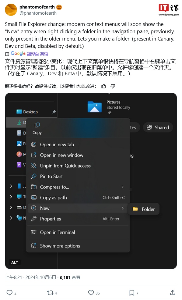 IT之家 10 月 8 日消息,消息源 @phantomofearth 于 10 月 6 日在 X 平台发布推文,曝料称微软正邀请 Canary、Dev 和 Beta 频道的 Windows Insider 项目成员,测试 Windows 11 24H2 文件管理器新特性,“新建”选项已挪到一级菜单中。