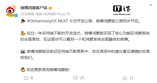 IT之家 10 月 8 日消息,华为 HarmonyOS NEXT 今日开启公测,微博鸿蒙版公测同步开启。